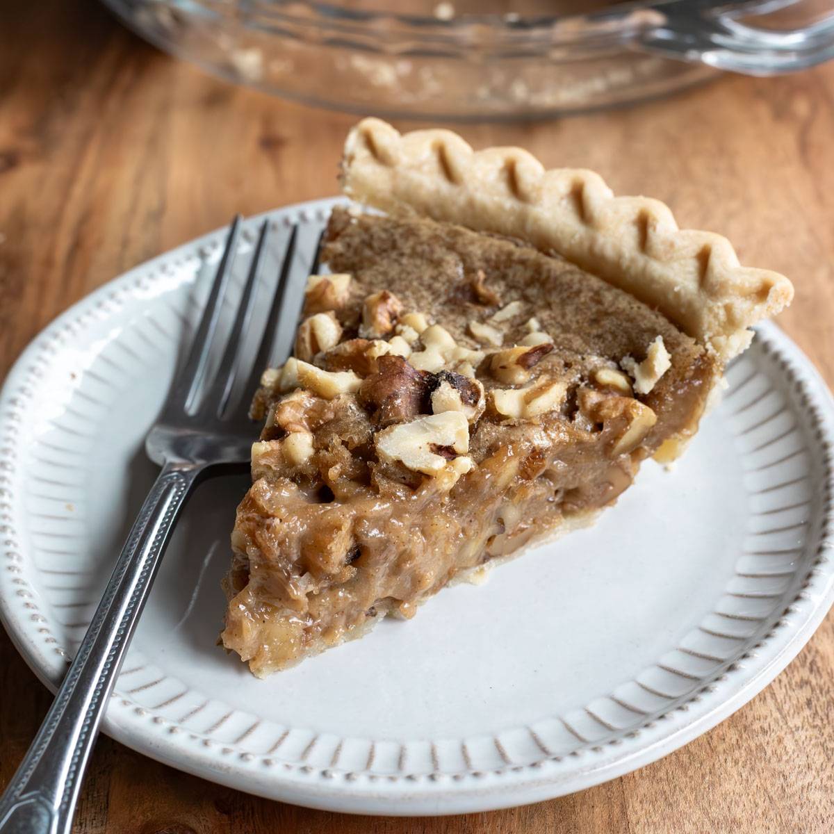 Similar to pecan pie but with walnuts, my vegan take on this Southern dessert is sweetened with maple syrup and brown sugar and includes a touch of pumpkin spice.
