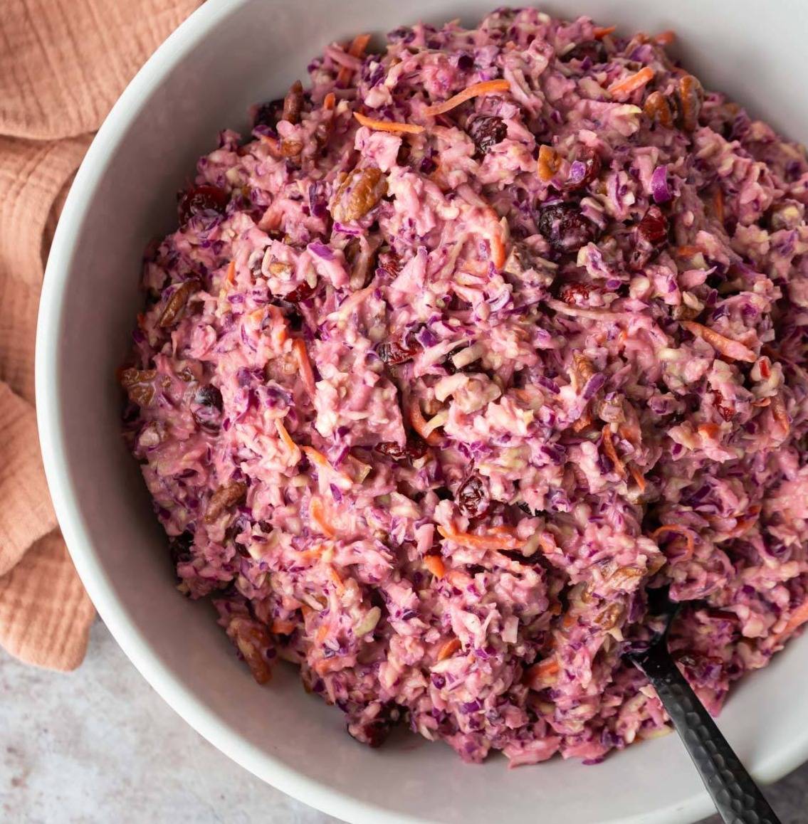Lightly fruity, sweet, and tangy, this creamy slaw is a refreshing contrast to heavier, savory dishes.