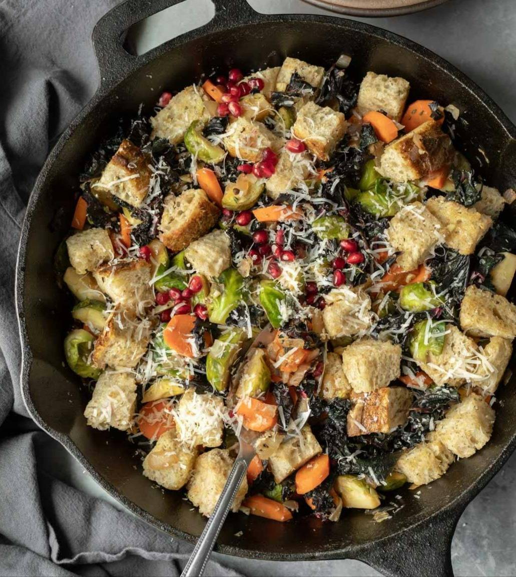 Instead of stuffing, why not shake things up this year with a warm panzanella salad? It's easy to prepare and features Brussels sprouts, kale, sourdough, and pomegranate.