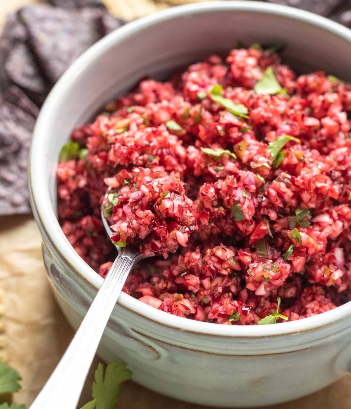 With tart cranberries and a touch of jalapeno, this colorful salsa is super easy to make and even easier to eat!