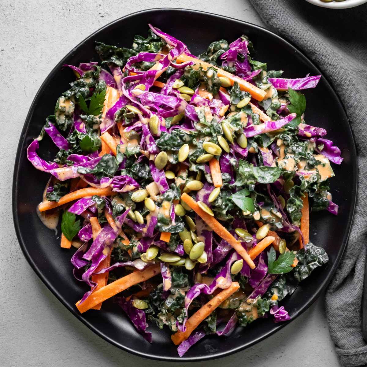 More Salads, Slaw & CabbageβKale Salad With Couscous & Harissa DressingββTahini Caesar SaladββQuick Kale SlawββCrockpot Cabbage SoupββLentil Cabbage SoupβOh, and a quick thank you to those of you who hit replay and said "YES" two weeks ago to my question about sharing a chocolate pie crust. That recipe is in the works and should be finished this week, quickly followed by a peanut butter and banana cream pie filling. β Find more on the blog: